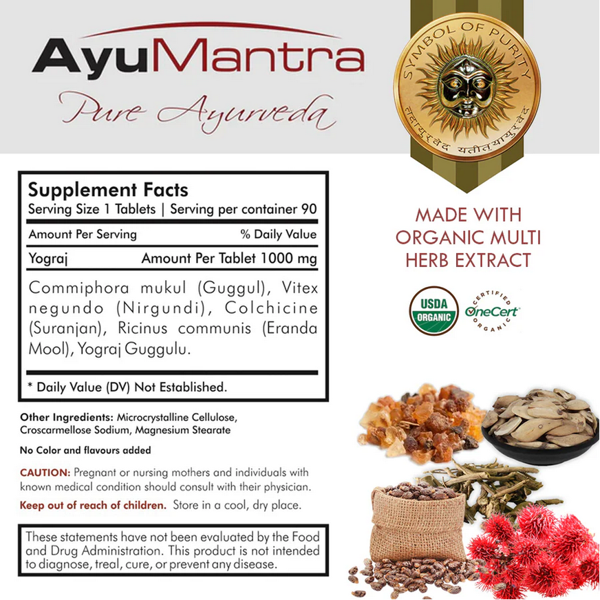 Yograj Guggul is a powerful anti-inflammatory and detoxifier for musculoskeletal joints and an equally effective neuromuscular rejuvenator. It Supports comfortable movement of the joints and muscles. Various causes of joint pains like Rheumatoid arthritis, Gouty arthritis are well managed with Yogaraj Guggul.